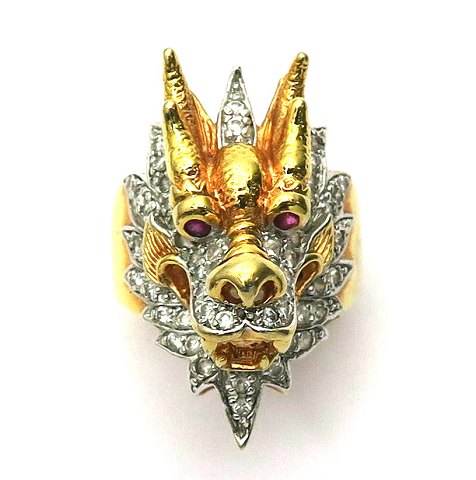 Ring af 18 kt. guld og hvidguld i form af dragehoved. Øjne med isatte, rubinrøde sten. Str. 53½, samlet vægt ca. 12 gr.