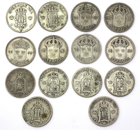 Sverige, 50 øre sølv, årstal 1875, -78, -81, -83, -98, -99, 1906, -07, -12, -14, -19, -28, -31 og 1933.