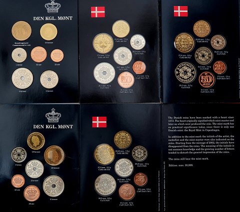 Møntsættene indeholder samtlige mønter i Danmarks møntserie i de pågældende år. I originale ubrudte blisterkort fra Den Kgl. Mønt. Sættet 1992 og 1995 indeholder desforuden årets medalje.