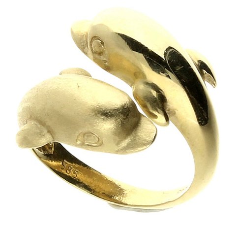 Ring af guld 14kt i form af 2 delfiner, den ene matslebet,den anden blankpoleret. Str. 50, vægt ca. 6 gr.