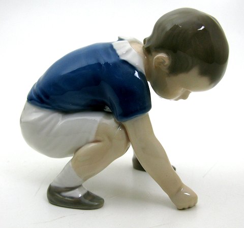 Bing & Grøndahl figur dess. 1636 i form af dreng som samler sten, L. 12 cm. 1. sortering. Ingen afslag eller revner konstateret. Design: Ingeborg Plockross Irminger.