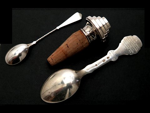 Lot bestående af vinprop af sølv, monteret på korkprop, samlet H. 9 cm. (Proppen er i "Bernadotte Pyramide" form), samt to erindringsskeer af sølv, L. 12,5 og 16, 5 cm. Samlet vægt ca. 85 gr.