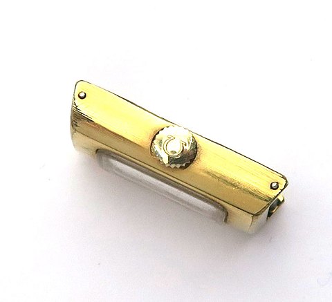 Guldtonet, struktureret skive med stregindikation. Manuelt meknisk optræksværk. Urkasse 15 x 27 mm. Ingen rem.