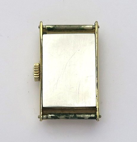 Guldtonet, struktureret skive med stregindikation. Manuelt meknisk optræksværk. Urkasse 15 x 27 mm. Ingen rem.