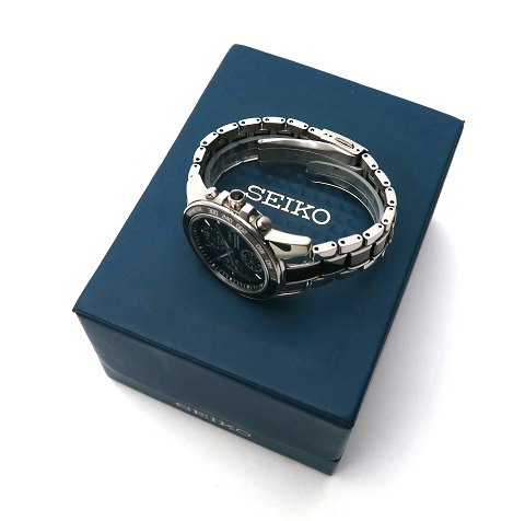 Seiko Sportura Chronograph herrearmbåndsur, ref. nr. 7T92ONOH i urkasse og med foldelænke af delvist sort tonet stål. Sort tachymeterkrans og sort skive bag mineralglas med stregindikation, central og separat sekundviser, datovisning i #3 position samt chronograph funktioner. Quartzværk. Urkasse diameter 38 mm.