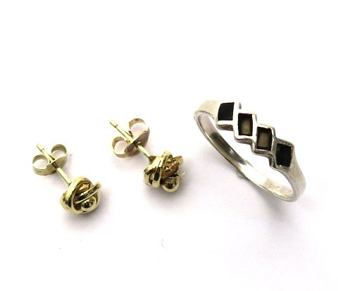 Par ørestikker af 8 kt. guld med rosetformet front (den ene roset er defekt). Ring af sterling sølv, oprindelig prydet med sort emalje (emalje defekt), Ring Str. 55.