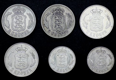 Christian IX / Christian X, 1 kr. og 2 kr. 1875 ~ 1916 sølv (6)