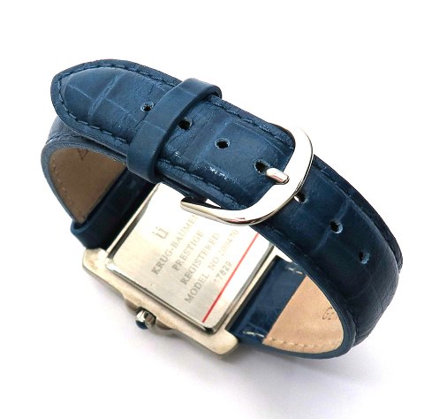 Krug Bäumen Prestige unisex armbåndsur, ref nr. 17829 i rektangulær urkasse af stål. Crèmehvid skive med romertal, central sekundviser og datovisning i #6 position. Quartzværk. Urkasse 28 x 29 mm. Crocopræg, blå læderrem med metalspænde.
