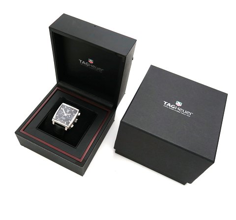 TAG Heuer Monaco Chronograph, ref. nr. CAW2110 i rektangulær urkasse af stål. Sort skive med stregindikation, central og separat sekundviser, datovisning i #6 position samt chronograph funktion. Automatisk værk caliber 12. Urkasse 39 x 38 mm. Crocopræg læderrem med Tag Heuer foldelænke.