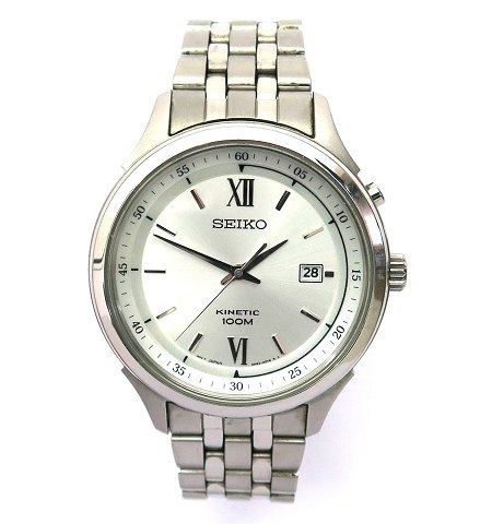 Seiko Kinetic herrearmbåndsur, ref. nr. 5 M 62 i urkasse og med foldelænke af stål. Metallic grå skive med stregindikation, central sekundviser og datovisning i #3 position. Kinetic urværk oplader batteriet ved bevægelse. Urkasse diameter 43 mm.