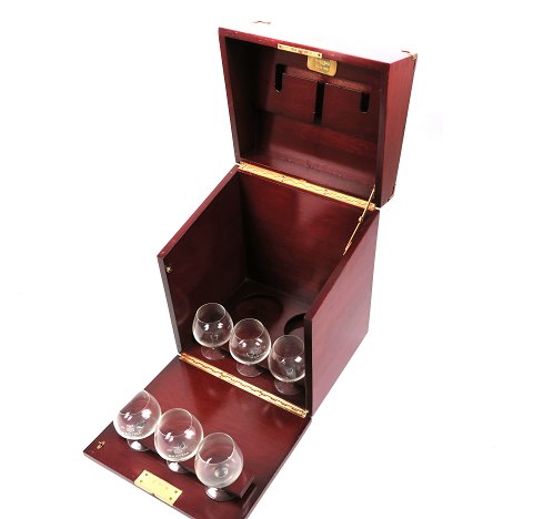 Martell, aflukkelig husbar af lakeret bøgetræ inkl. 6 Martell drikkeglas og plads til to cognacflasker. 27 x 23 x 34 cm. Nøgle til låsen medfølger.