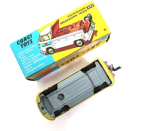 Corgi Toys die cast toy car #Volkswagon Breakdown Truck*, L. 11 cm., including all tools, reserve tires and tow hook. Mint & Boxed.