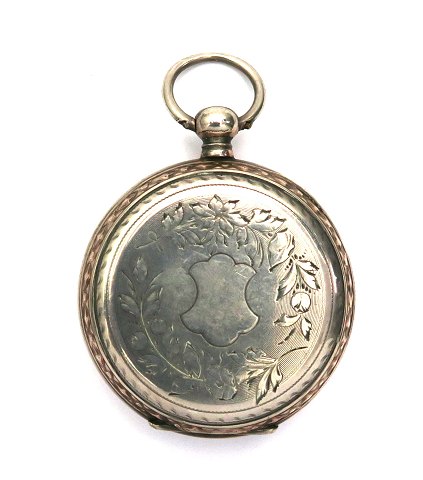 Galonnè lommeur af sølv med vid emaljeskive, sekundrans og romertal samt separat sekundviser. Værk med nøgleoptræk. Urkesse diameter 47 mm.Optræksnøgle medfølger.