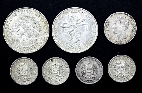 2x 25 Pesos Mexico 1968, sølv (.720), hver diameter 38 mm., vægt 22,5 gram. Venezuela 1 Bolivar 1960 sølv og 3x 1965 sølv, hver diameter 23 mm., vægt 5 gram. 2 Bolivares 1960, diameter 27 mm., vægt 10 gram.