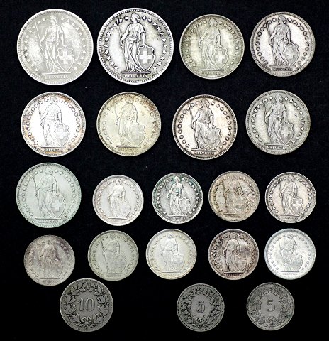 Schweiz, 5 Rappen ~ 2 Franken 1883 ~ 1967 sølv og cn (21)