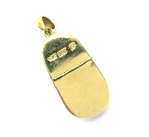Vedhæng af 14 kt. guld i form af tøffel, prydet med rubinfarvede sten, L. 29 mm., samlet vægt ca. 5 gr.