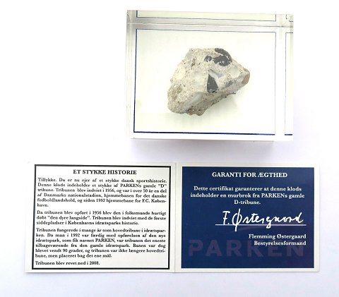 Parken memorabilia i form af fragment fra den nedbrudte D-tribune i Parken. Fragmentet er istøbt en plexiglasklods og certifikat, udstedt af Flemming Østergaard medfølge. Plexiglaskods 85 x 65 x 45 mm.