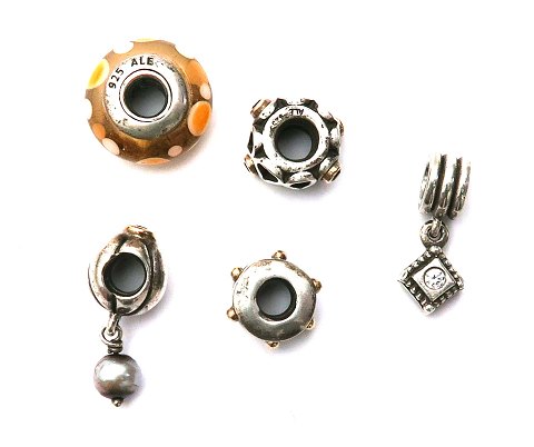 Lot bestående af trolldbead med glasdekoration, to trollbeads med vedhæng samt to trollbeads med stendekoration.