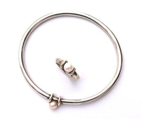 Armring og ring af sterling sølv, prydet med 6½ mm. perle