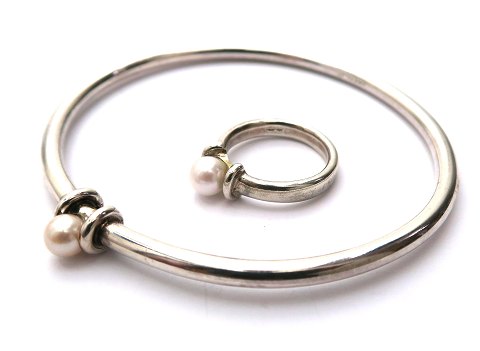 Armring og ring af sterling sølv, prydet med 6½ mm. perle