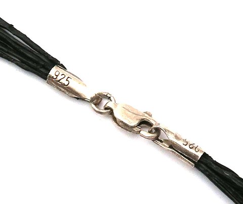 Halssmykke med 8-radet lædersnøre, med vedhæng og lås af sterling sølv. L. 40 cm., samlet vægt ca. 13 gr. Design Torben Hermann Meier - København.