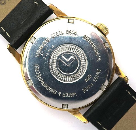 Lanco herrearmbåndsur, ref. nr. 420 i urkasse af gulddoublé med bagkapsel af stål. Metalgrå skive med stregindikation, central sekundviser og datovisning i #3 position. Manuelt mekanisk optræksværk kaliber 1004. Urkasse diameter 32 mm. Fornyet læderem med metalspænde.