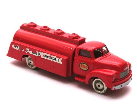 LEGO tankvogn af rød plastik med metalhjul *Benzin ESSO Smøreolje*, L. 90 mm. Bilen har ingen karosserideformation, dog er decals lidt beskadiget.