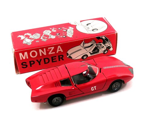 Tekno, legetøjsbil af støbemetal # 931 *Monza Spider GT*, L. 10,5 cm. Lakafslag foran på taget, ellers pæn i originalæsken.