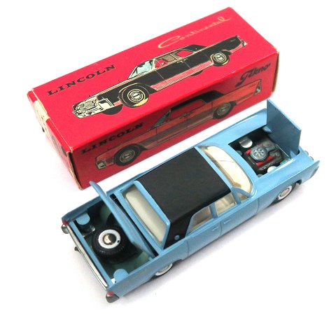 Tekno, legetøjsbil af støbemetal # 829 *Ford Lincoln Continental*, L 12,5 cm. Lakafslag på hjulkapsler, ellers næste ny i originalæsken. L. 12,5 cm.,