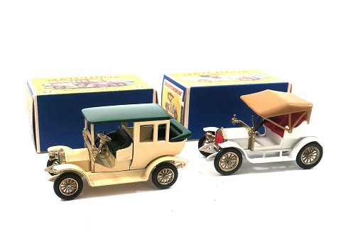 Lesney Matchbox legetøjsbiler af støbemetal og plast - Models of Yesteryear #Y3 Y4 *Benz Limousine 1910 og Opel Coupé 1909*, begge L. 8 cm. Begge ny i originalæsken.