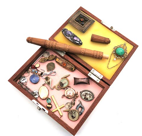 Skrin af bøgetræ med ældre bijouteri, medaljoner samt en cylindrisk træbeholder til f. eks. opbevaring af røgelsespinde.