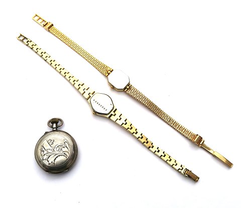 Dobbeltkapslet damelommeur af sølv med hvid emaljeskive, romertal og stregindikation, urkasse diameter 32 mm. samt Zaphira og Regent Quartz damearmbåndsur af guldtonet metal.