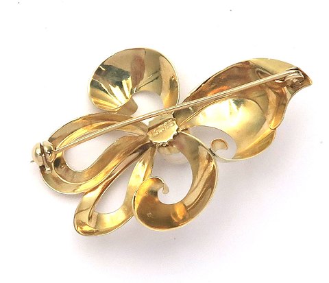Broche af 14 kt. guld, prydet med 6 mm. perle