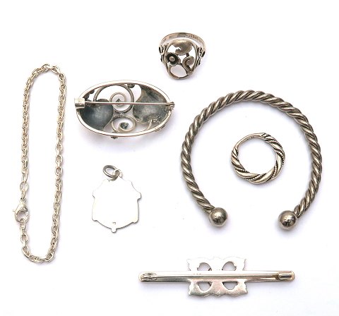 Lot bestående af snoet armring, anker armlænke, broche, nål vedhæng og to ringe, str. 48 og 54. samlet vægt ca. 51 gr.