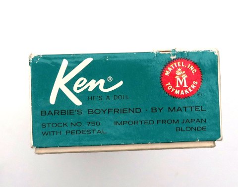 Mattel Ken legetøjsdukke #750 fra 1960'erne *Blond Ken* i originalæske med stativ, sandaler og fritidstøj.