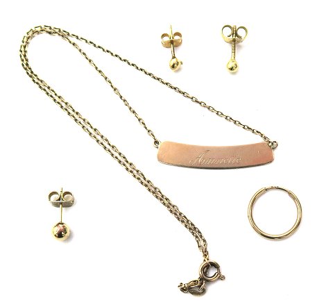 Anker halskæde med fast vedhæng (navneskilt med inskription) af 8 kt. guld samt creoler ørering af 8 kt. guld. Kæde L. 36 cm., ørestik diameter 15 mm., samlet vægt ca. 3,5 gr. Desforuden medfølger tre ørestikker af gulddoublé.