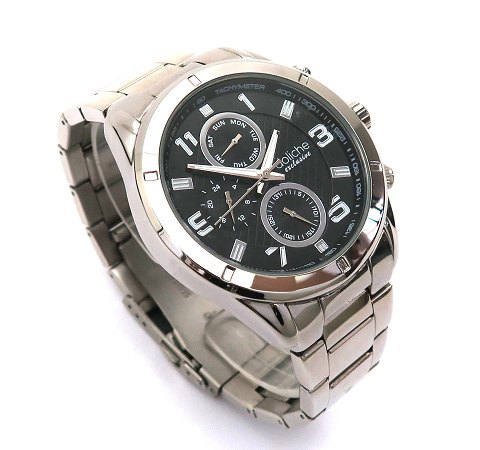 Doliche Exclusive chronograph herrearmbåndsur, ref. nr. DW 1056-1 i urkasse og med foldelænke af stål. Sort skive bag mineralglas med arabertal og stregindikation, 12/25 timer visning, central sekundviser, separat dag og datovisning samt chronograph funktion. Quartzværk. Urkasse diameter 46 mm.