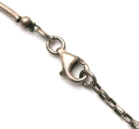 Halssmykke af sterling sølv, buede led prydet med facetslebne, safirblå sten. Kæde L. 39 cm., samlet vægt ca. 8 gr.
