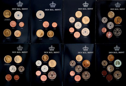 Lot bestående af 8 stk. Kgl. møntsæt. Møntsættene indeholder samtlige årets mønter i Danmarks møntserie præget i særlig høj kvalitet. Nogle af sættene indeholder en 20 kr. erindringsmønt: 1990 Dronning Magrethes 50 års fødselsdag, 1995 1000-års mønt, 1996 HkH Prins Joachims bryllup med Prinsesse Alexandra. I originale, ubrudte emballager fra Den Kgl. Mønt.
