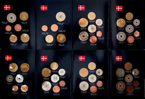 Lot bestående af 8 stk. Kgl. møntsæt. Møntsættene indeholder samtlige årets mønter i Danmarks møntserie præget i særlig høj kvalitet. Nogle af sættene indeholder en 20 kr. erindringsmønt: 1990 Dronning Magrethes 50 års fødselsdag, 1995 1000-års mønt, 1996 HkH Prins Joachims bryllup med Prinsesse Alexandra. I originale, ubrudte emballager fra Den Kgl. Mønt.