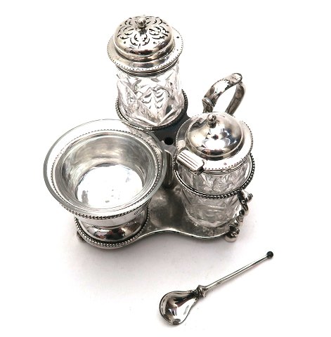 Plat de ménage af sterling sølv, holder dekoreret med svunget hank og perlebord, indeholdende sennepskrukke med ske, peberstøbøsse og saltkar. Beholdere af slebet glas. H. 10 cm.