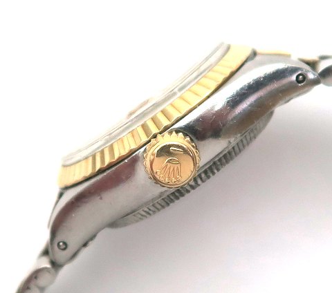 Rolex Oyster Perpetual Date damearmbåndsur, ref. nr. 6917 i urkasse og med foldelænke af guld/stål. Metallic grå skive bag plexiglas med stregindikation, central sekundviser og datovisning i #3 position. Automatisk værk. Urkasse diameter 26 mm.
