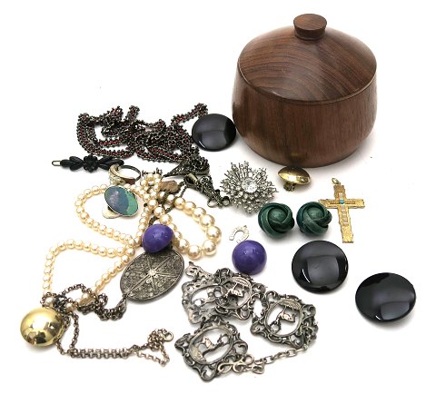 Bonbonniere af teaktræ, indeholdende vintage bijouteri. Bonbonniere H. 9 cm.
