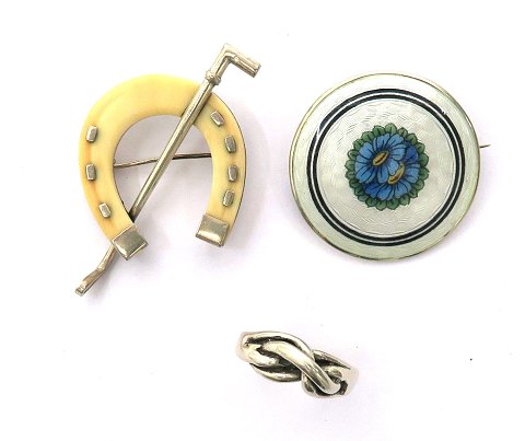 Dansk Museums kopi ring af sterling sølv, Str. 58, samt engelsk Polo broche af sølv og emaljebelagt broche af sølv, diameter 36 mm., samlet vægt ca. 30 gr.