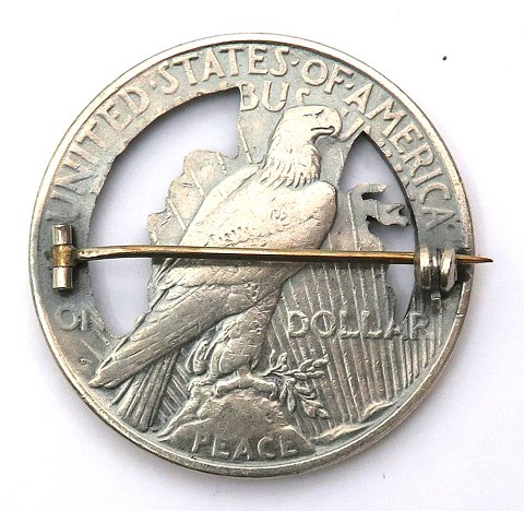 Delvist frilagt broche i form af USA Dollar 1922 sølv, diameter 38 mm.