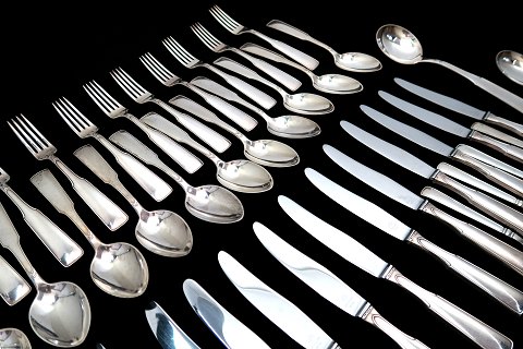 Hans Hansen Arvesølv 2 bestik bestående af 12 middagsgafler, 11 middagsskeer, 12 middagsknive, 4 kagegafler, 1 Kartoffelske, 1 potageske, 1 sauceske, 1 flødeske, 1 grøntsagsske, 1 marmeladeske, , 1 stegegaffel, 1 asiegaffel samt 1 kagespade. Samlet vægt uden knive ca. 1,665 kg.