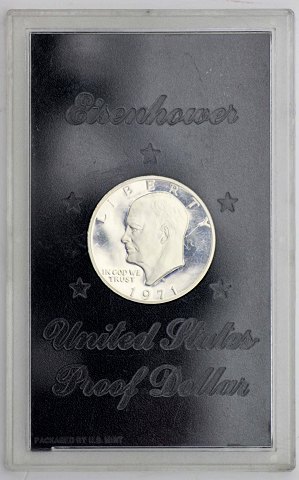 USA, one Dollar 1971 sølv (.400) *Eisenhower*, vægt 24.59 gr, diameter 38.1 mm. Mønten er monteret i plexiglasetui fra U.S. Mint.