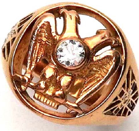 Ring af 14 kt. guld, prydet med dobbeltørn diamant i gl. slib på ca. 0.50 ct. og justitssymboler i form af justitsvægt og kors. Ring Str. 69, samlet vægt ca. 15,5 gr.