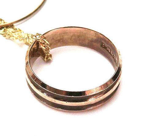 Lot bestående af snoet halskæde af 14 kt. guld, L. 52 cm., vægt ca. 1,5 gr., par creoler øreringe af 14 kt. guld, vægt ca. 1,2 gr. samt vielsesring af 8 kt. guld med indvendig gravure og datering, lille Str. 36, vægt ca. 3 gr.