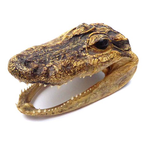 Hoved af yngre alligator med åben gab, L. 18 cm. Ifølge oplysning hjemtaget til Danmark fra Florida i 1950'erne.
